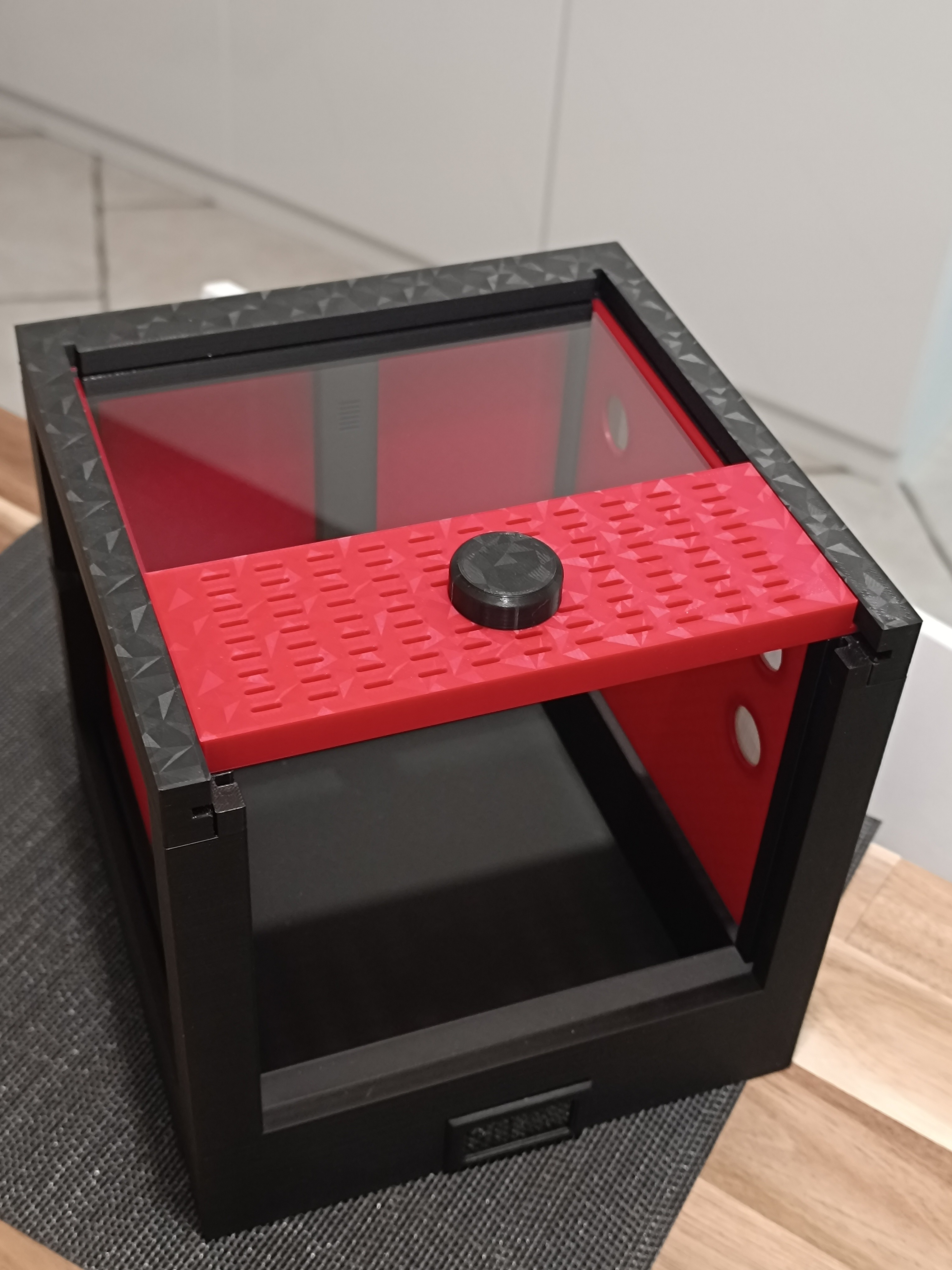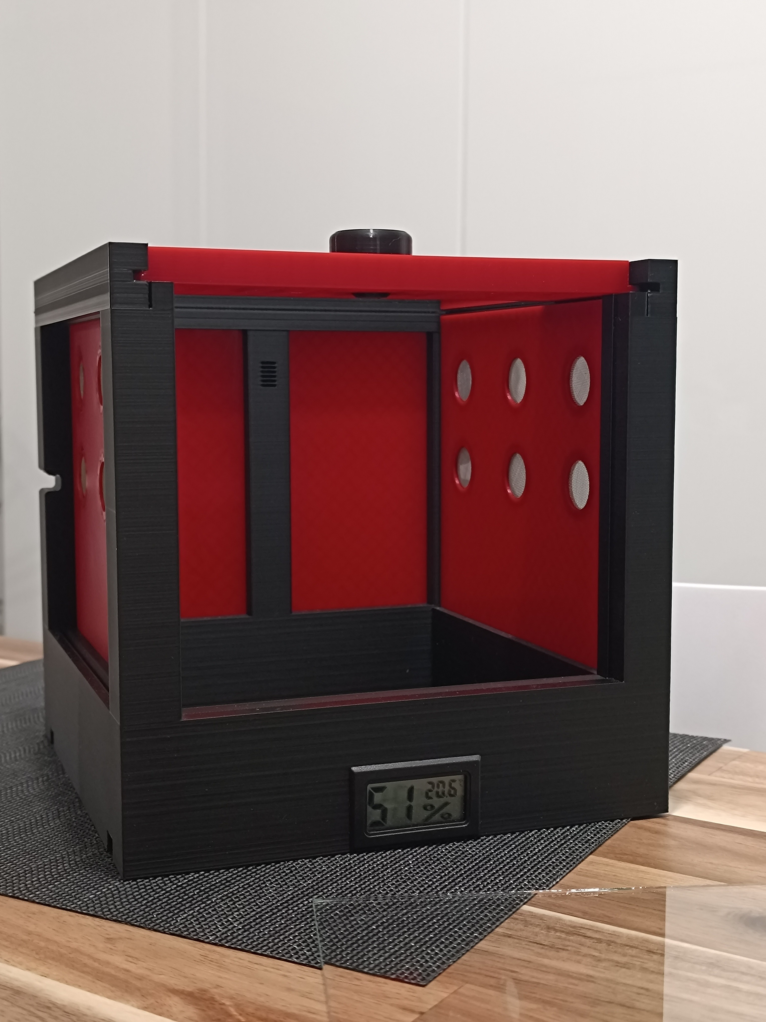 Ce terrarium de 20 ×20 × 20 cm présente une conception à la fois esthétique, modulaire et fonctionnelle, bien pensée pour l’élevage d’arachnides comme les Phidippus regius (de L7 à adulte) ou d’autres petits arthropodes. Nous vous conseillons de vérifier que l'animal ne puisse pas passer par les trous d'aération AVANT de l'y installer.