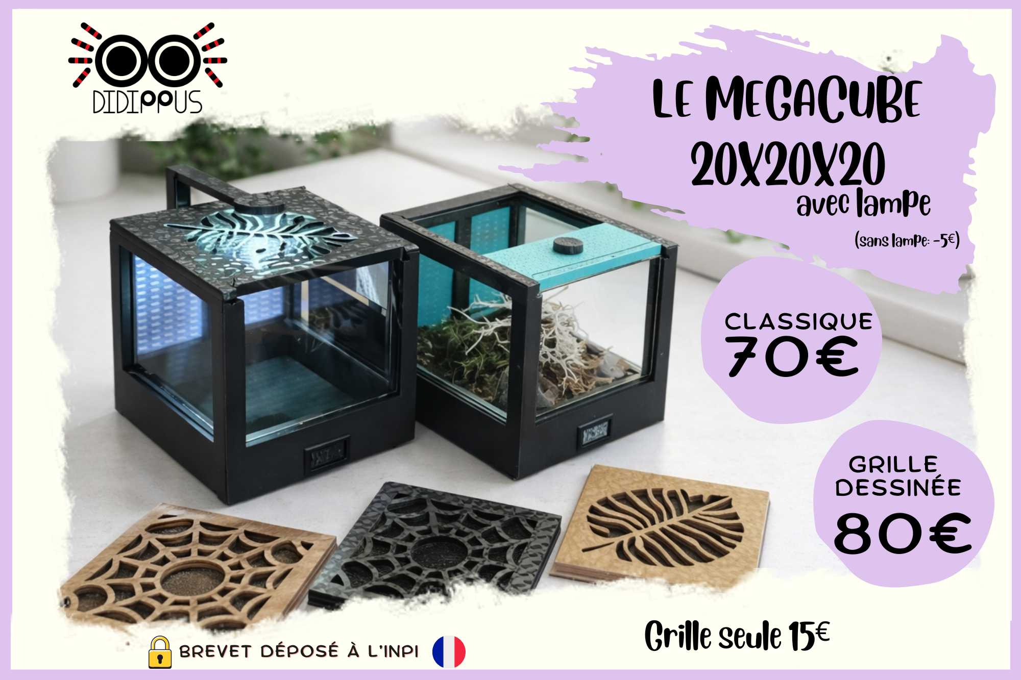 Dimensions : Format cube 20 ×20 × 20 cm → taille idéale pour un individu adulte, permettant une bonne observation tout en assurant une surface exploitable verticale et horizontale.