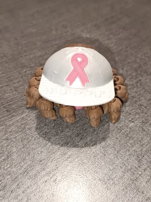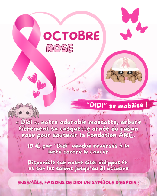 Cette année, nous allons un peu plus loin avec “Didi”, notre petite araignée mascotte, qui pour l’occasion s’est habillée spécialement et arbore sa casquette blanche ornée du ruban rose, symbole de la lutte contre le cancer du sein.