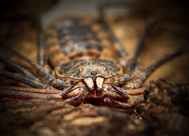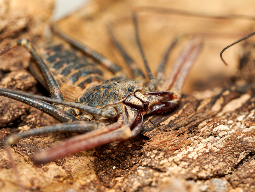 Pinces (pédipalpes) : Puissantes, en forme de harpons, utilisées pour la capture des proies.