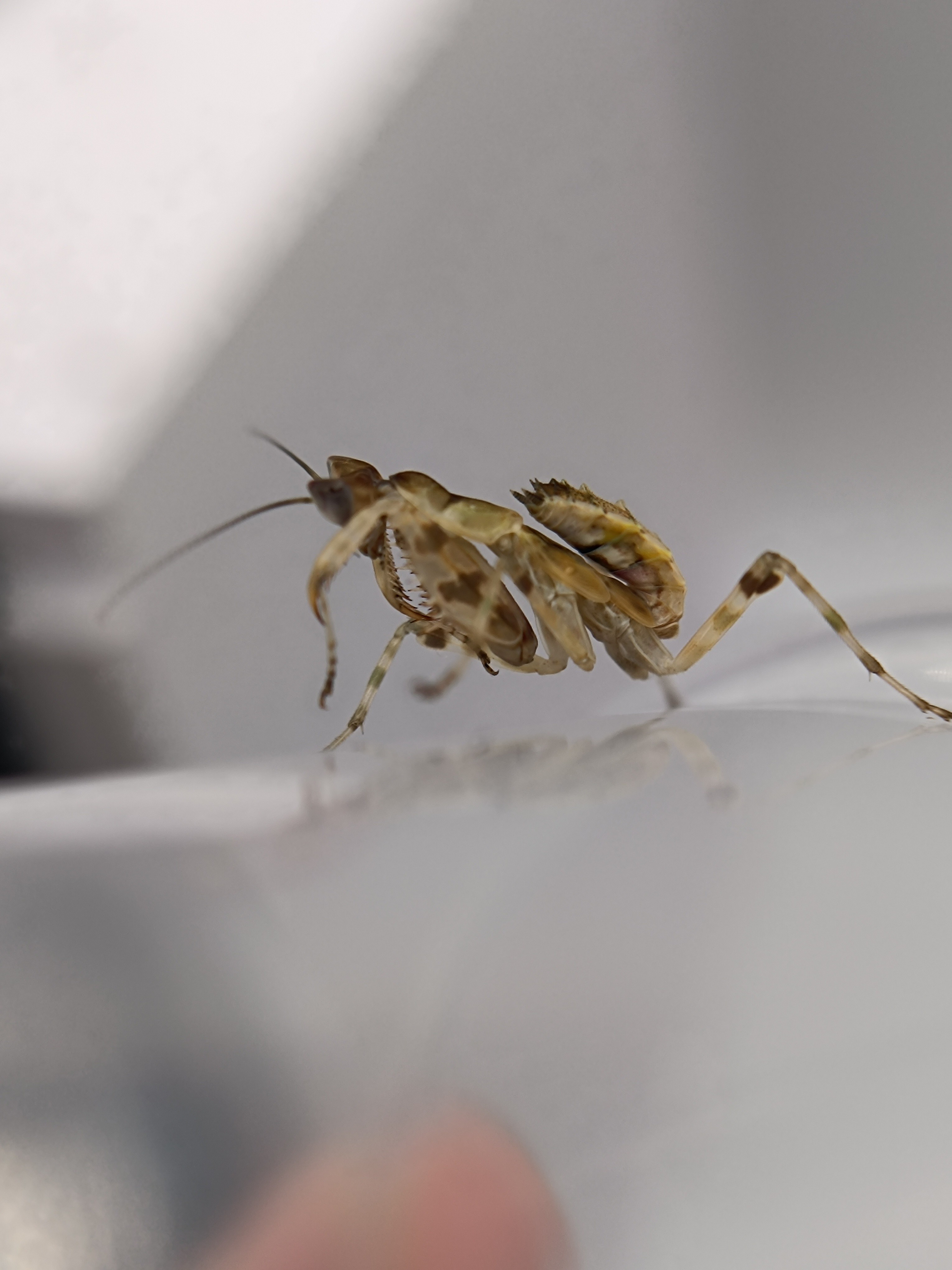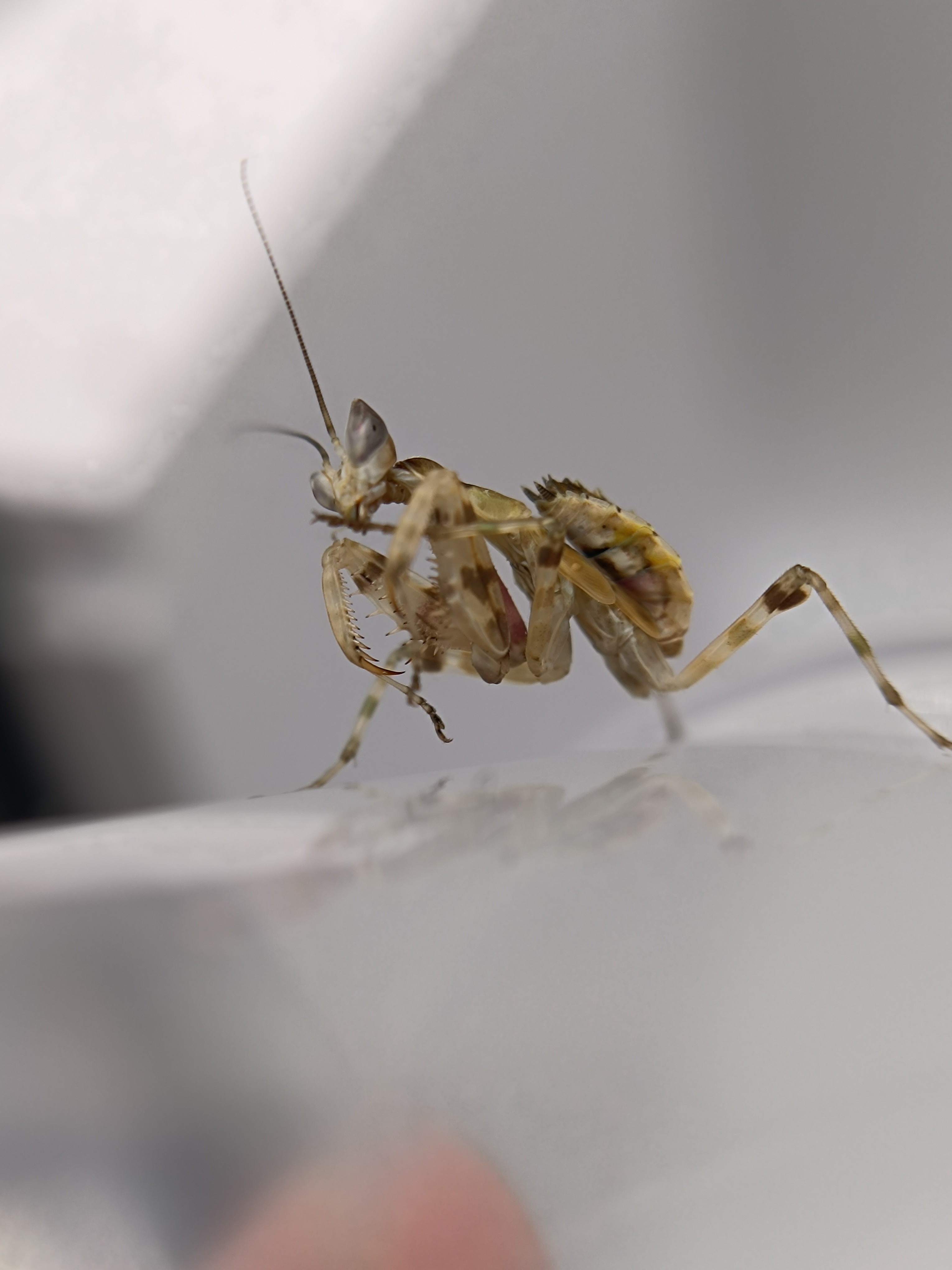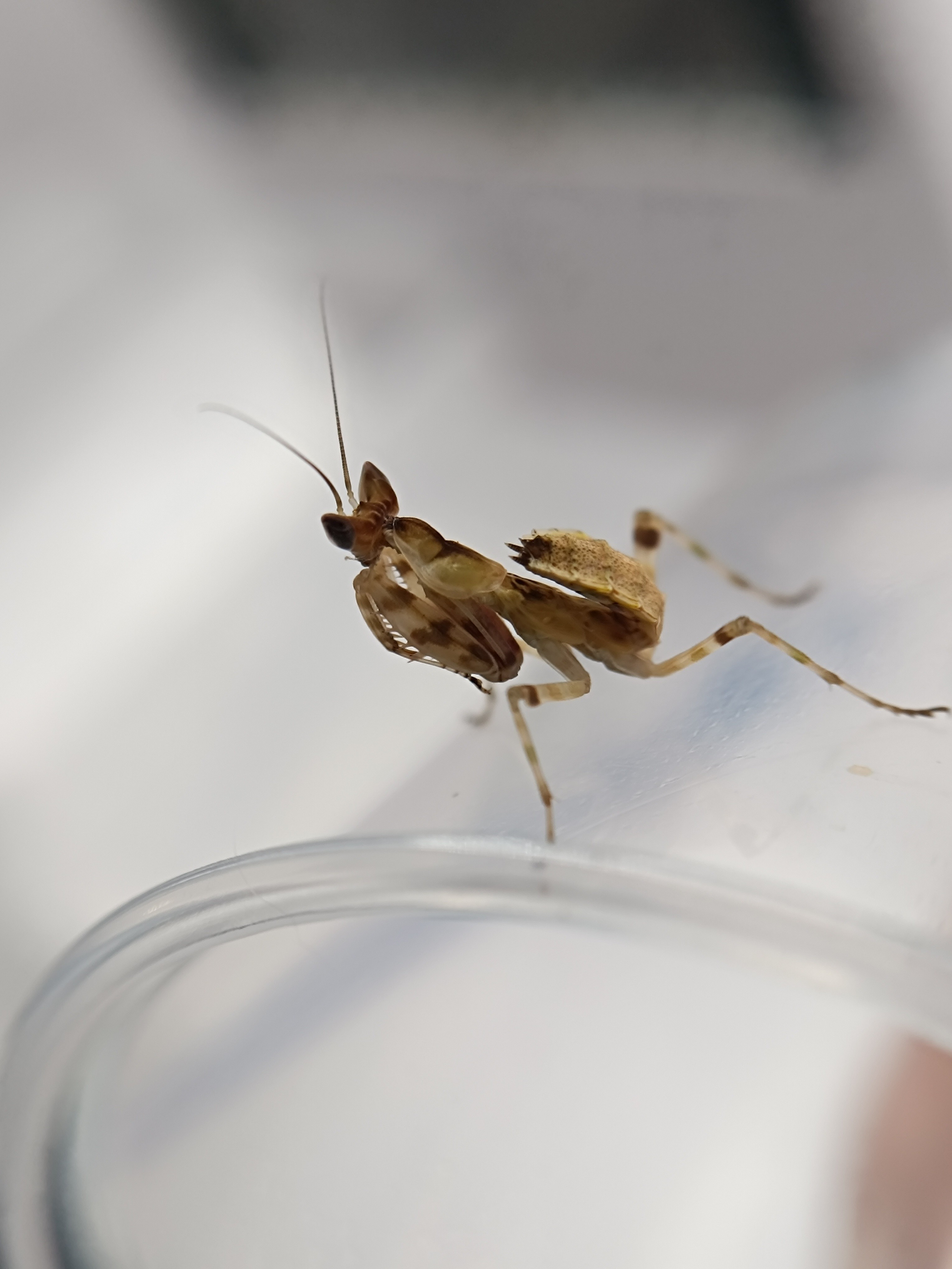 Pulvérisation légère (la mante boit l’eau déposée sur les feuilles et branches)