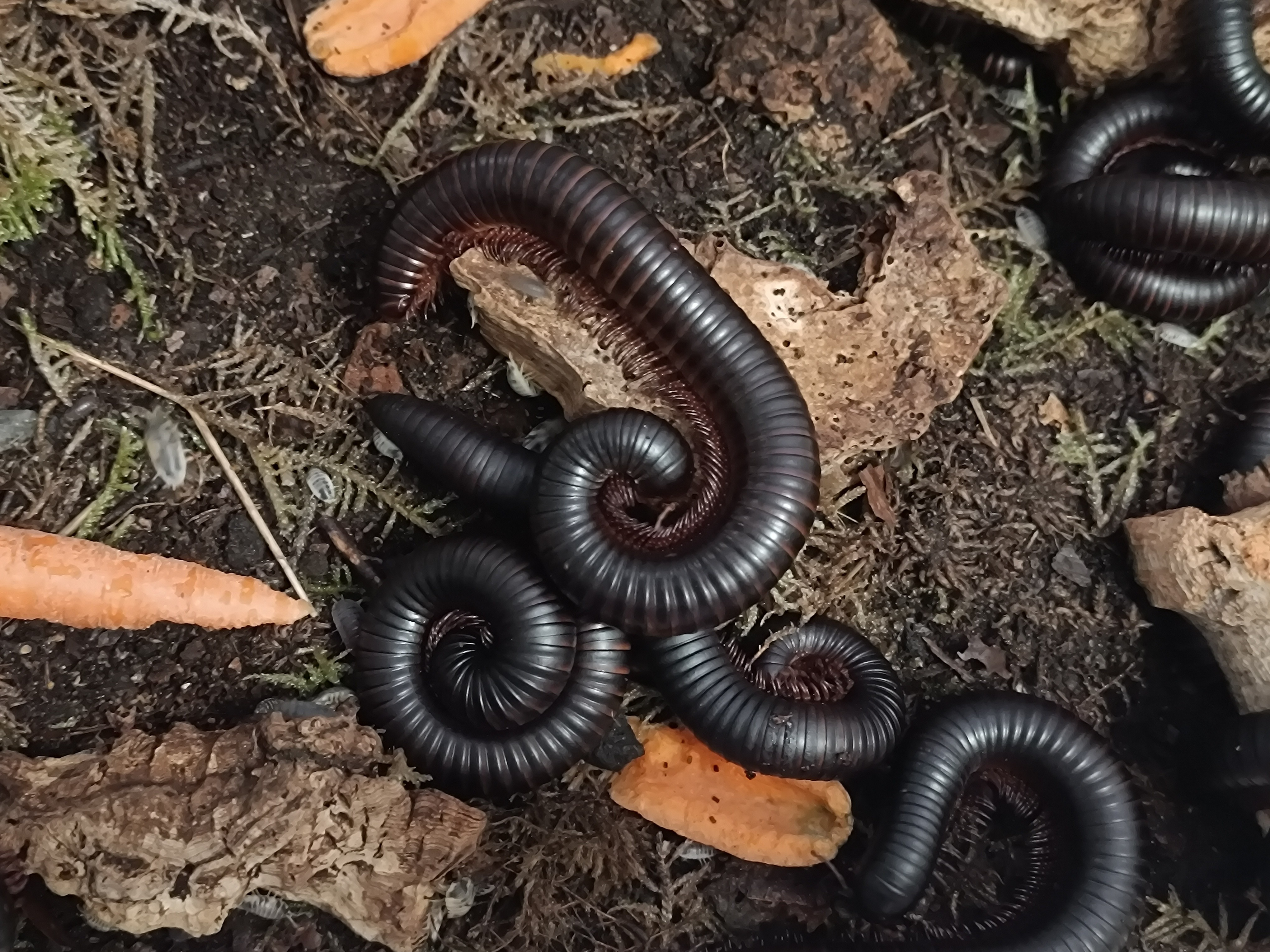 Corps brun à noir, luisant, articulé de nombreux anneaux.