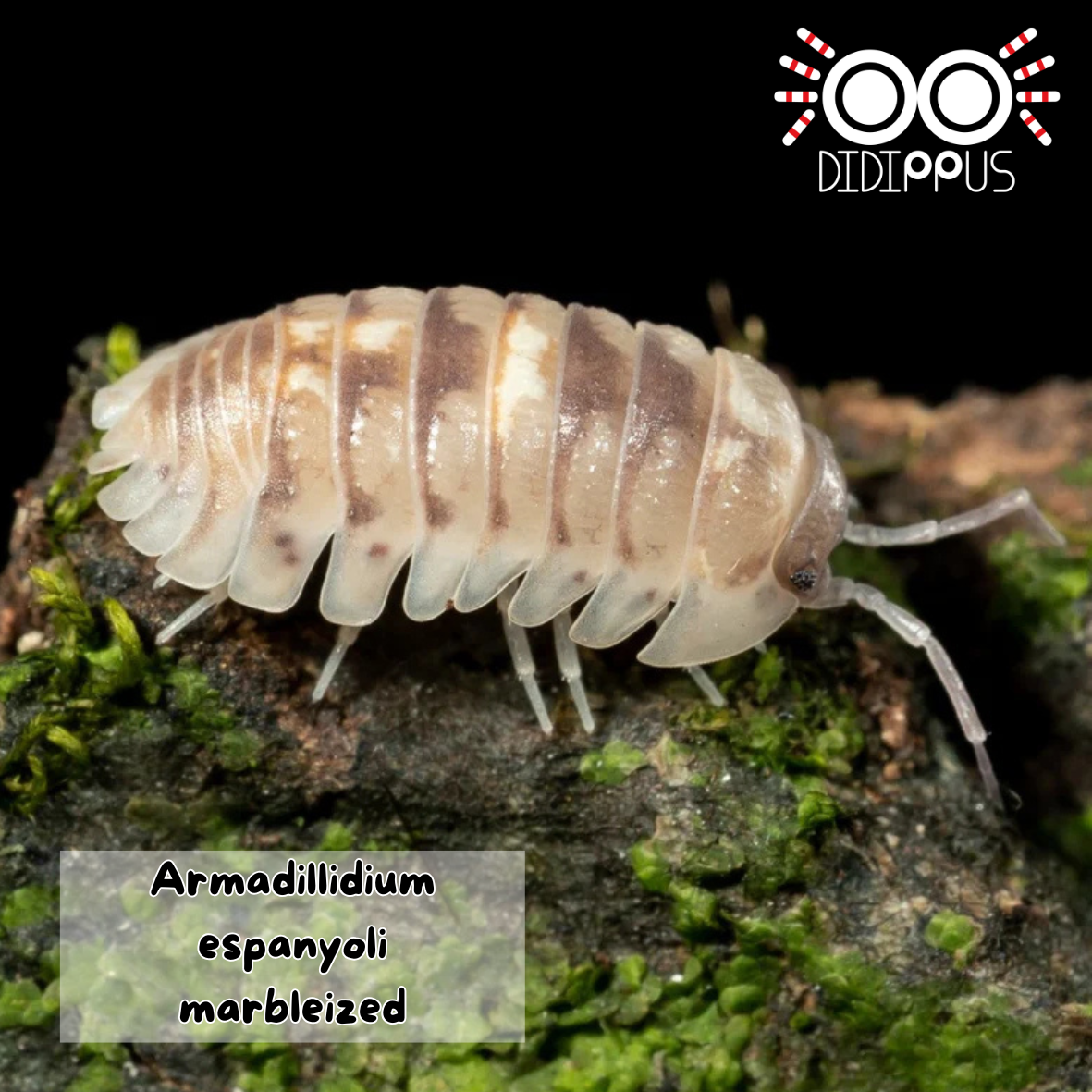 Armadillidium espanyoli est une espèce robuste et plutôt active. La forme “Marbleized” se distingue par ses magnifiques marbrures irrégulières. C’est une espèce simple à maintenir, idéale pour débutants comme confirmés.